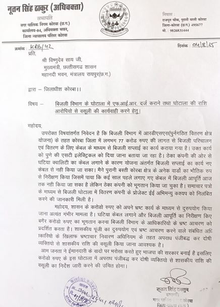 कोरबा । नगर पालिक निगम कोरबा सभापति नूतन सिंह ठाकुर ने बिजली विभाग में करोड़ों रुपये के कथित घोटाले का आरोप लगा उक्त मुद्दा जोर-शोर से उठाते हुए प्रदेश के मुख्यमंत्री विष्णुदेव साय को पत्र लिखा है। उन्होंने इस घोटाले की उच्चस्तरीय जांच कर संबंधित दोषियों पर एफआईआर और शासन की राशि वसूली की सख्त मांग करी हैं।