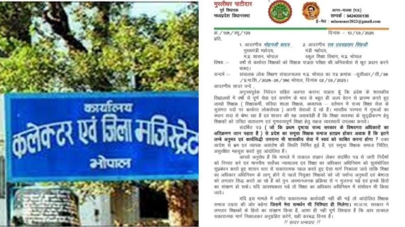राजधानी भोपाल में आज शाज 4 बजे प्रदर्शनकारी कलेक्ट्रेट कार्यालय में एकत्रित होकर टीईटी (TET परीक्षा) परीक्षा के विरोध में प्रदर्शन करेंगे और कलेक्टर को ज्ञापन सौंपेंगे. संगठन के कार्यकारी प्रदेश अध्यक्ष उपेन्द्र कौशल ने बताया कि लोक शिक्षण आयुक्त कार्यालय के 2 मार्च 2026 के आदेश में प्रदेश के लाखों शिक्षकों को सरकार ने टीआईटी परीक्षा उत्तीर्ण करने के निर्देश दिए हैं. जिससे शिक्षकों में असंतोष की स्थिति बनी हुई है।