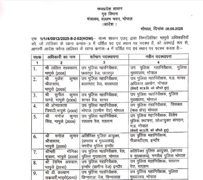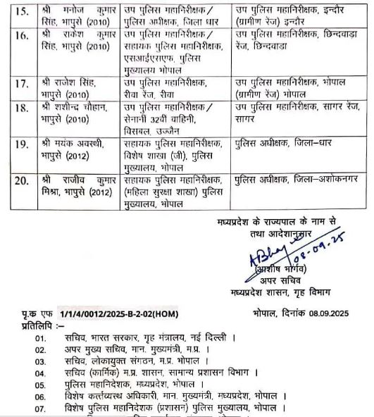 एमपी में बड़ा प्रशासनिक फेरबदल, 20 आईपीएस अधिकारियों का तबादला